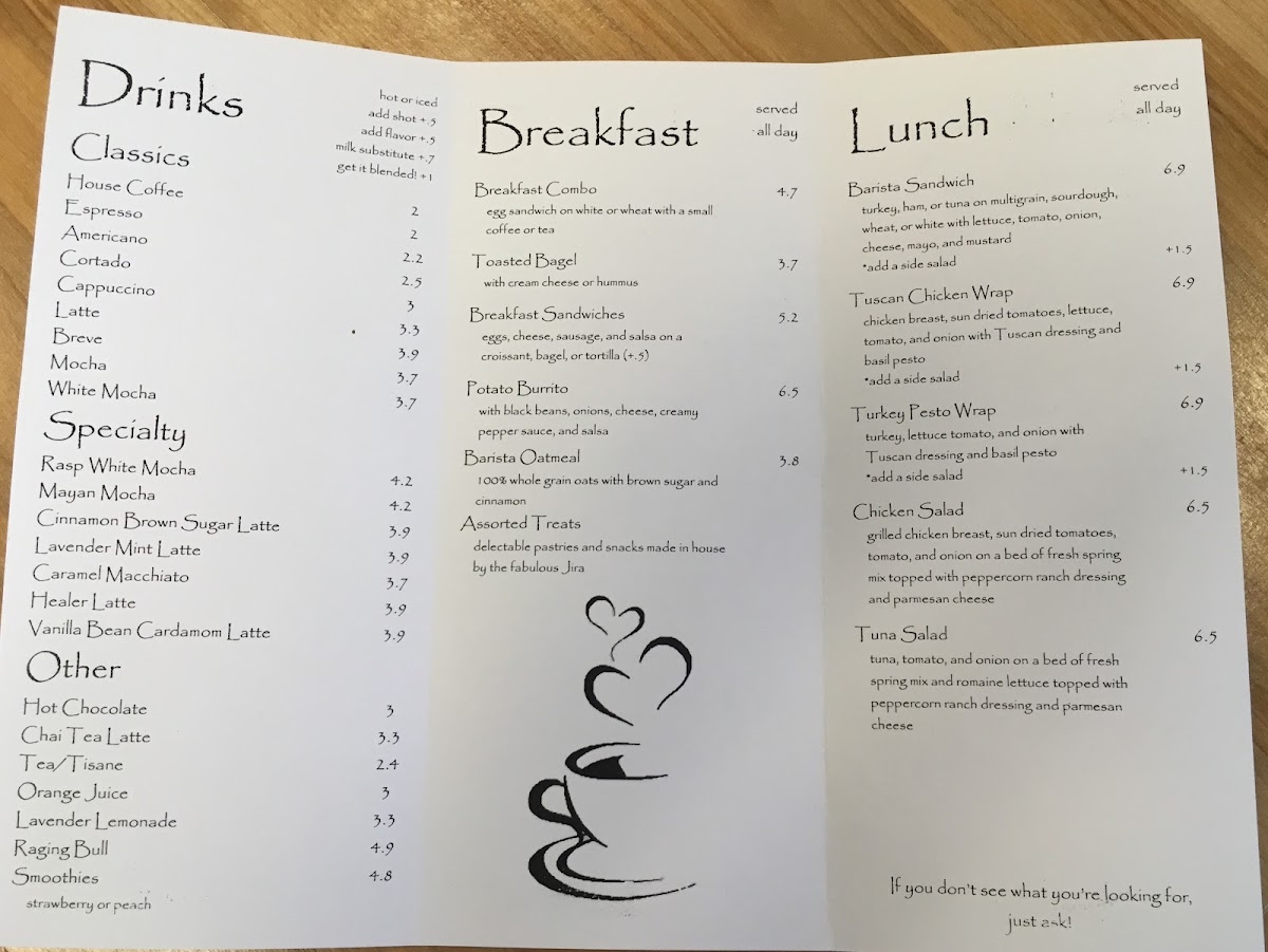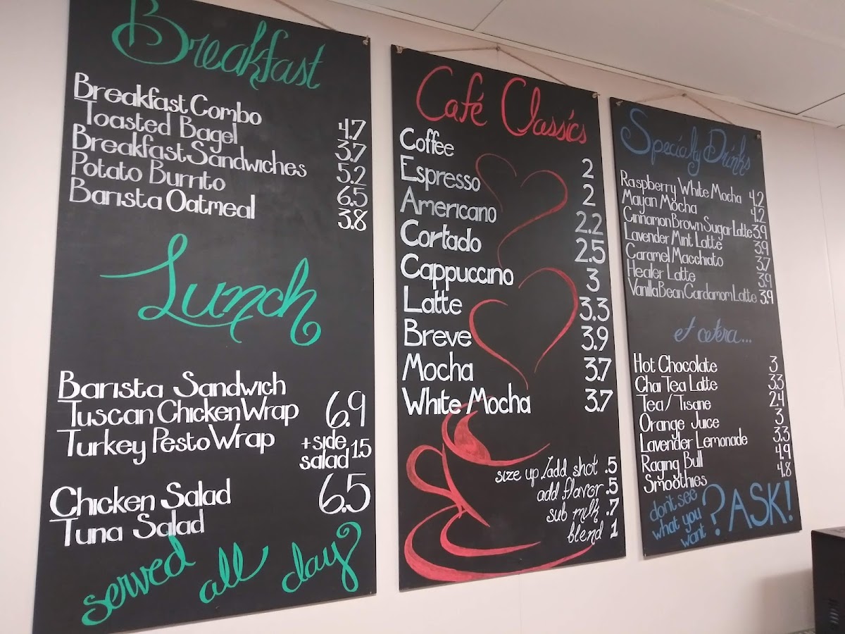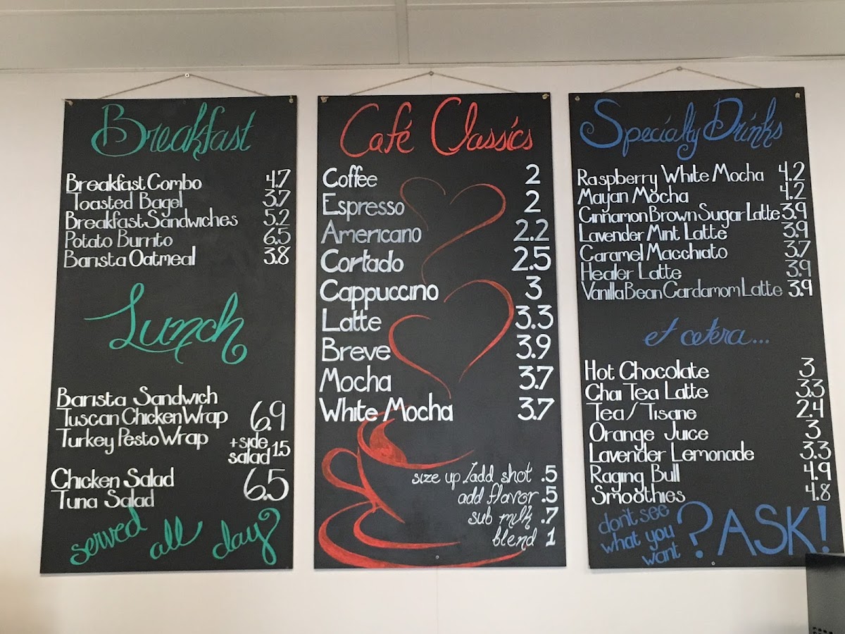 Black Frog Coffee offers a variety of options that cater to all tastes, whether you're stopping by for a quick breakfast, a hearty lunch, or something to satisfy your sweet tooth. For breakfast, you can choose from the Breakfast Combo, the classic Toasted Bagel, or enjoy a more filling Breakfast Sandwich or Potato Burrito. The Barista Oatmeal is also a great choice for a light start. Moving on to lunch, the menu features delicious wraps like the Tuscan Chicken Wrap and Turkey Pesto Wrap, along with hearty options such as the Barista Sandwich, Chicken Salad, and Tuna Salad. For those looking to enjoy a café classic, Black Frog Coffee serves a range of espresso-based beverages, including Coffee, Espresso, Americano, Cortado, and Cappuccino. Specialty drinks are also a standout, with crowd favorites like the Raspberry White Mocha, Mayan Mocha, Cinnamon Brown Sugar Latte, Lavender Mint Latte, and Caramel Macchiato. To complement your drink, there are comforting options such as Hot Chocolate, Chai Tea Latte, a selection of TeaTisane, and refreshing Orange Juice. Overall, the menu at Black Frog Coffee is diverse and full of delicious choices, offering something for every taste and craving throughout the day.